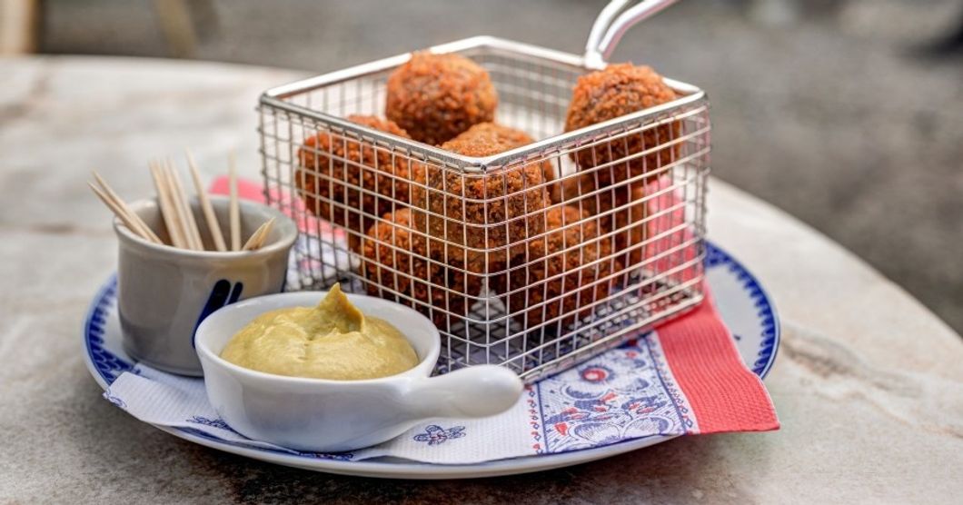 Bitterballen can be found in both restaurants and on the street, but where ever you decide to eat them, they are a perfect snack. This little snack is a ground beef croquette platter served with mustered. These little things are crispy on the outside and soft on the inside. The salty snack is great with a Dutch beer (of course, if you're of age).