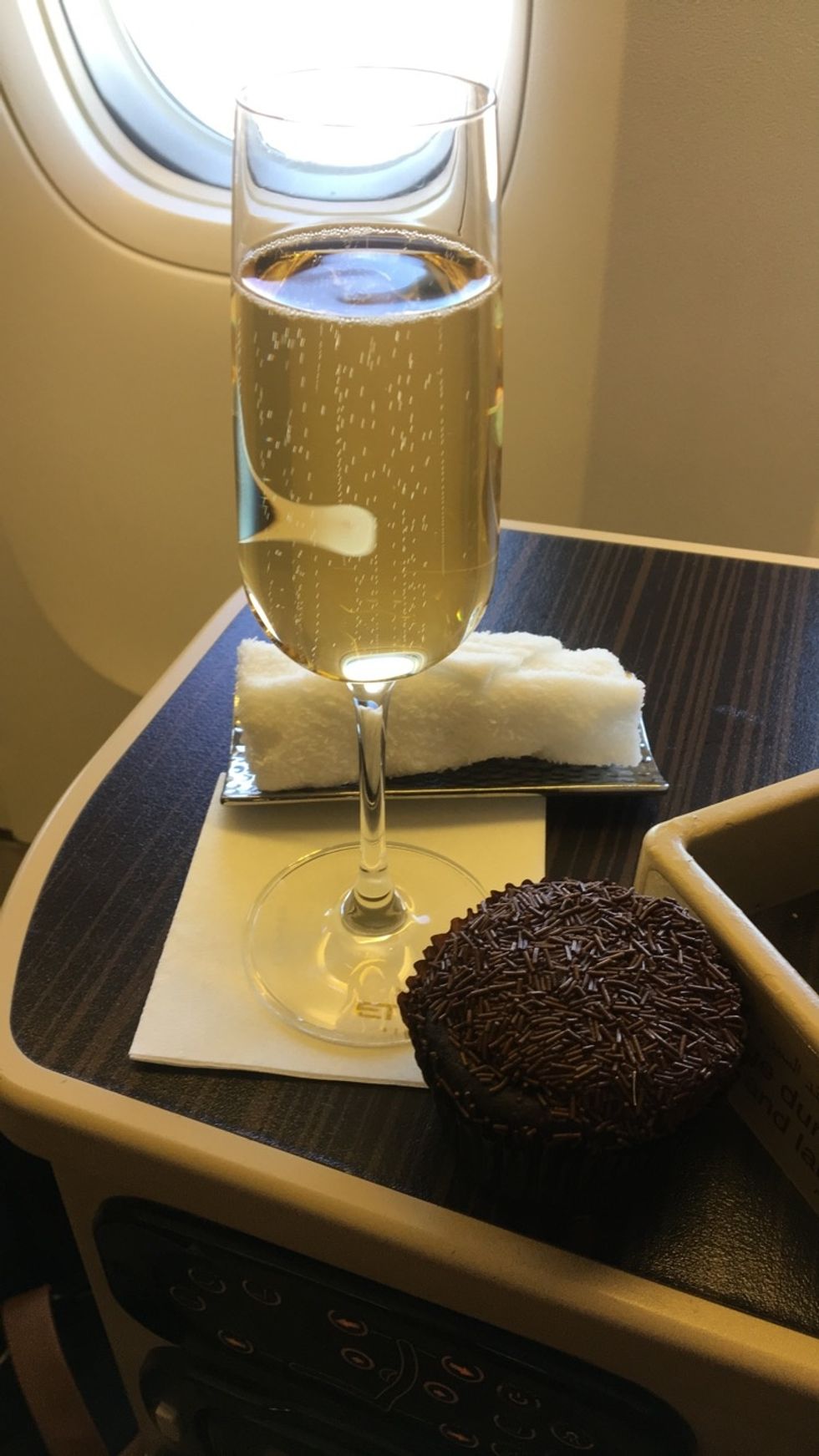 I spent an hour or so there as I ate before I made way to gate where the flight had begun boarding. I was guided to the front of the aircraft where a flight attendant insisted on placing my bags for me as I settled down. Soon after another flight attendant, came by with welcome drinks, I chose champagne to go with the dark chocolate cupcake I brought from the airport.