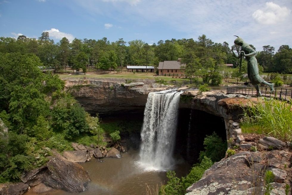 Noccalula Falls is another impressive waterfall in north Alabama. The waterfall drops ninety feet into Black Creek below. The falls name is derived from Noccalula, an Indian princess who is said to have lived nearby. Legend has it that Noccalula jumped over the falls to her death after her father would not let her marry the warrior that she loved and tried to force her to marry the chief of a neighboring tribe. The falls is also surrounded by a park that features a campground, five miles of hiking trails, a mini golf course, a small zoo, a train, and several examples of early settler buildings.