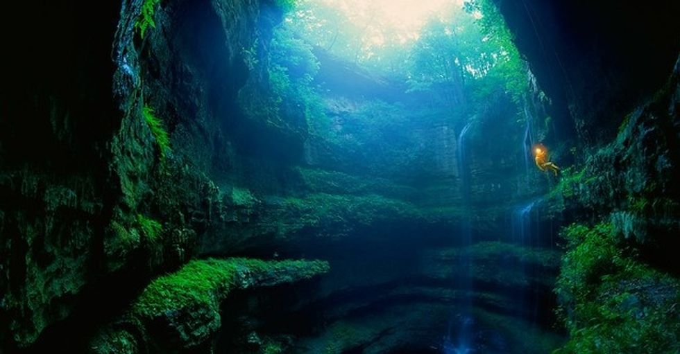 Neversink Pit is a gigantic sinkhole in northeast Alabama. The hole is forty feet wide at the top and 162 feet deep and is one of the most photographed sinkholes in America. Many rare plant species grow inside the pit, and several bats also call it home. Waterfalls form after rainstorms throughout the year, and in the winter, ice sheets from inside the hole. Neversink is open to experienced rappellers and cavers, but they must obtain a permit to enter the pit from the Southeastern Cave Conservancy who owns Neversink Pit.