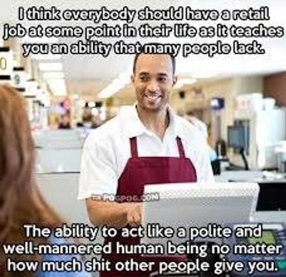 - Your retail worker is not beneath you. After working at my job in retail for only a few months, I reached the painful truth that some customers believed they sat in a seat above me. It was as if I did not have the education value because I was behind the cash register instead of being waited on. Most retail workers that I worked with were highly intelligent and were either in undergraduate or graduate classes, just working in retail as a side job