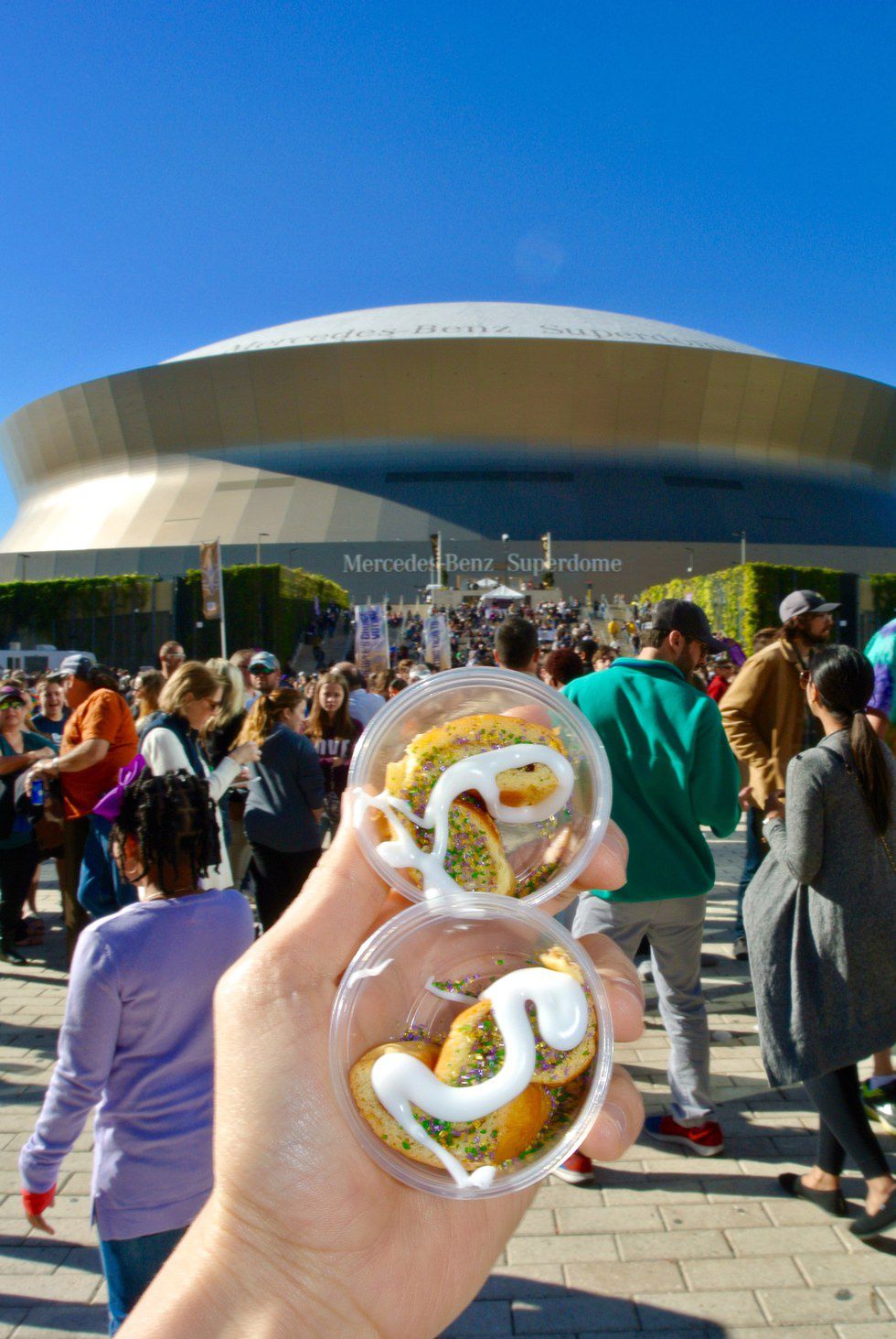 The festival is free to attend, but if you actually want to eat king cake (and why would you not?) then its one-dollar per ticket and one ticket per king cake sample. We got 10 tickets each because we wanted to sample allll the king cake. There were tons of vendors that each offered their own unique version of king cake. All of these vendors gathered together in Champion Square meant we had access to almost every version of king cake possible. I’m talking praline stuffed, berry chantilly versions, a twist of snicker doodle, cream cheese stuffed, and of course the always delicious traditional. Not to mention king cake cupcakes, donuts, ice cream, and king cake on a freaking stick! It was absolutely king cake heaven.