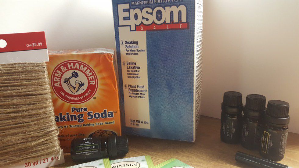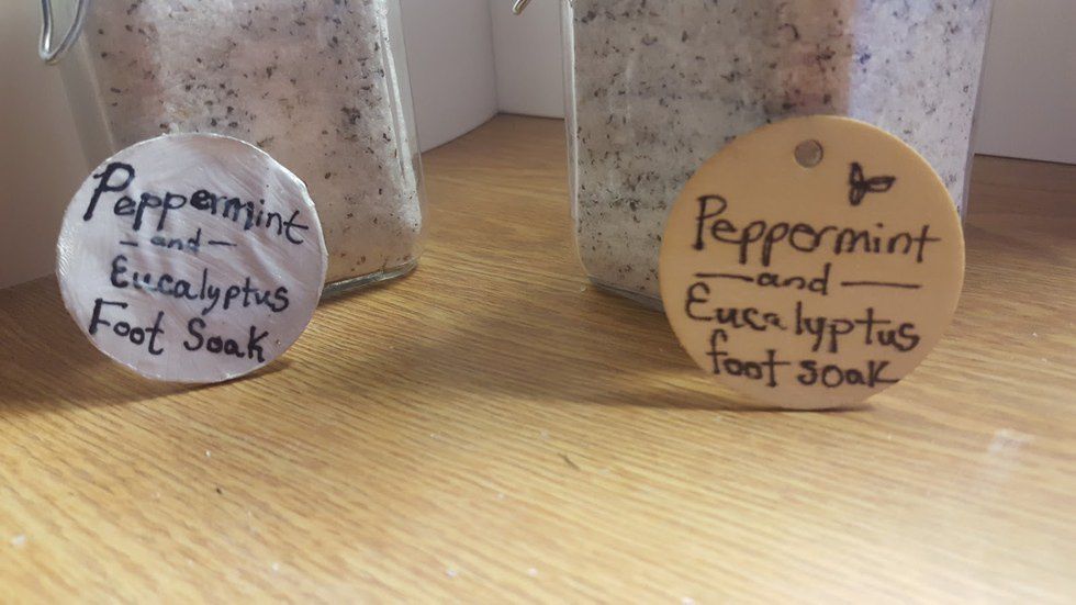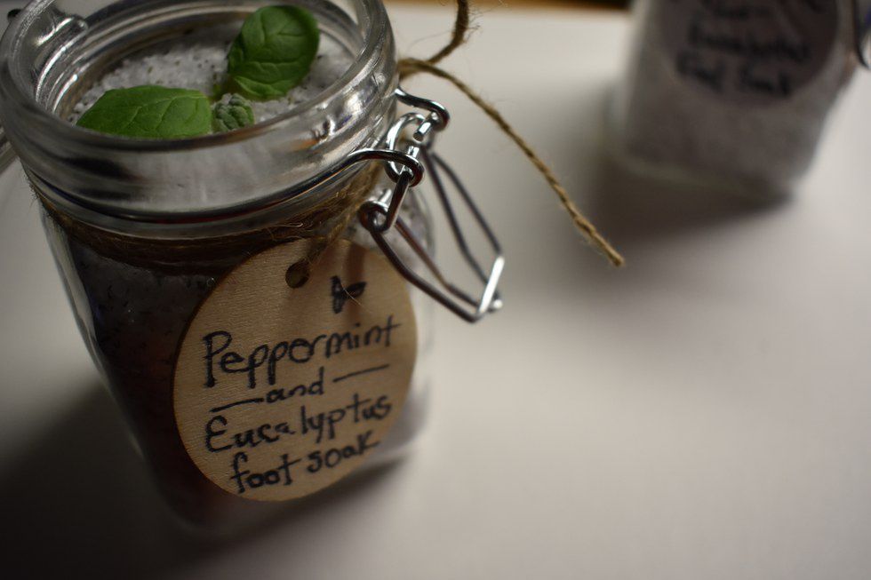 The only required ingredients are Epsom Salts, Baking Soda, and essential oils (which I recommend Peppermint both for its relaxing scent, but for it’s antibacterial and antifungal properties which makes it especially nice for feet, but you can use whatever scent you’d like).