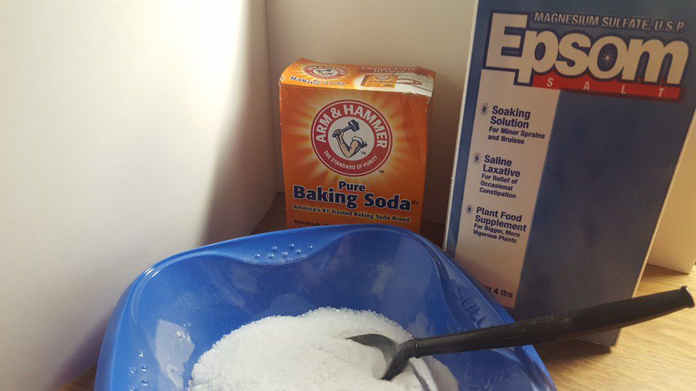 Mix up the Epsom Salts and the Baking Soda, using three parts salts to each part of Baking Soda. Combine these two ingredients well before adding in the other elements to ensure that you’ve gotten them well-mixed and broken any chunks of Baking Soda.