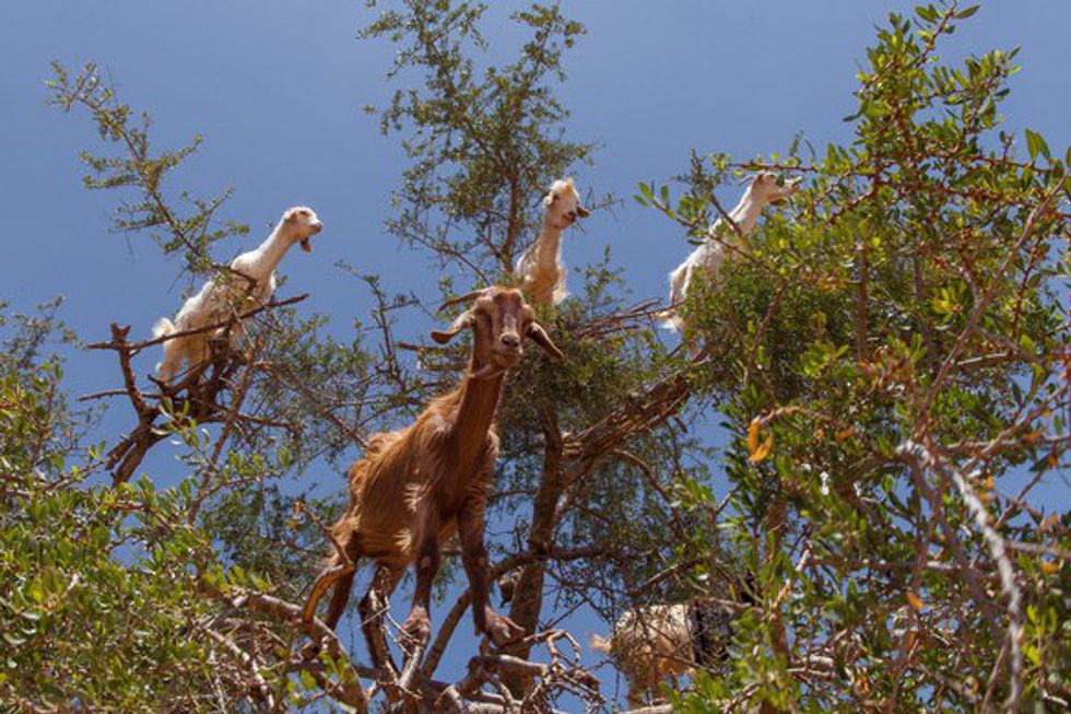 This unique phenomenon almost only happens in Morocco because these goats are attracted to the Argania Tree. The tree produces fruit yearly that attracts hoards of goats to climb its limbs and eat the fruit. Because the goats have two toes on each foot, it makes it perfect for them to cling onto the branches and balance high up in the trees to feed on the fruit that ripens annually.