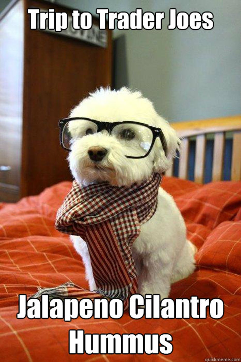 Probably the trendiest thing to eat, and its not hard to see why. This might have been limited to culture, or bean sprout wrap loving hipsters. But now we put hummus on everything, even better when we put it on our gluten-free pita chips bought at Trader Joes, which we shop at while wearing birks and high-waisted shorts. Am I right? Also peep the cute hipster puppy.