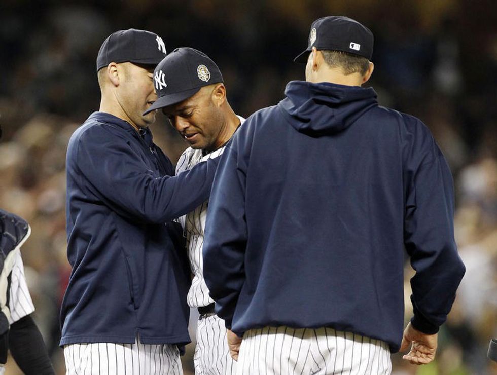 Just when you thought it couldn't get any more emotional, Jeter walks out on the field with Andy Pettitte to comfort Mariano. Three of the core four reunite for a memorable moment. Where are the tissues? Seriously, though.