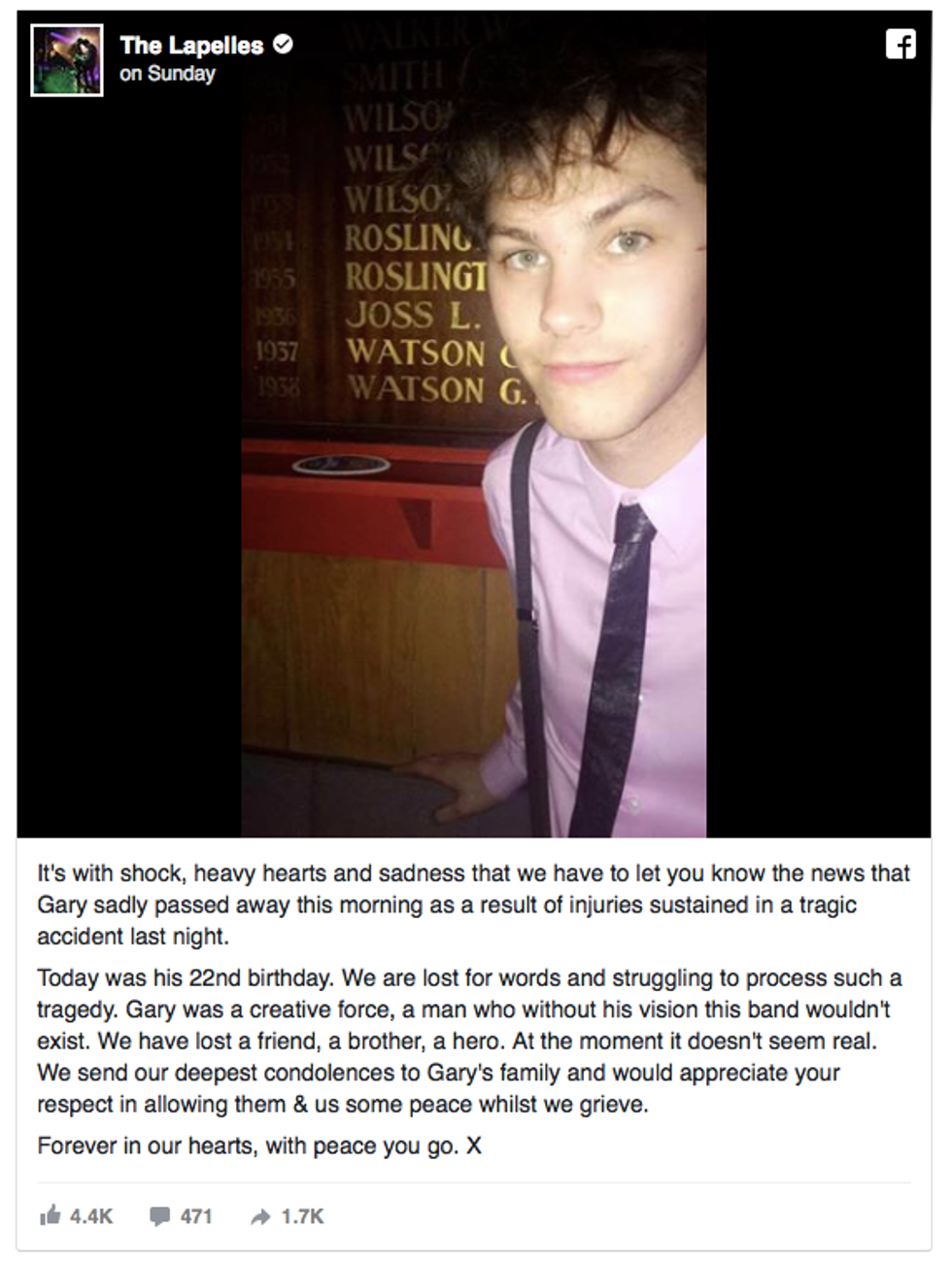 Last Sunday, the band posted a statement on their Facebook page (pictured below) that the band's lead singer and guitarist, Gary Watson, had passed away from injuries in an accident from the previous night. Gary died on what would've been his 22nd birthday. I was absolutely crushed. The Lapelles were definitely towards to top of my list of bands that I was looking forward to seeing live. When I read the band's statement, I was utterly shocked and saddened.