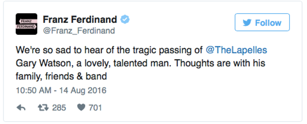 Gary Watson was one of those once in a lifetime musicians that, without a doubt, would've gone on to so many great things. Though I never knew him personally, after watching and reading many interviews with him, he seemed like such a happy, funny guy with an absolute passion for his bandmates and the music they were making. Watson was definitely a one-of-a-kind talent with a voice that will never be forgotten. The world will never forget his contributions to music or the happiness that he brought to anyone who ever saw the band live or ever listened to The Lapelles. My thoughts are with all of Gary's family and friends.