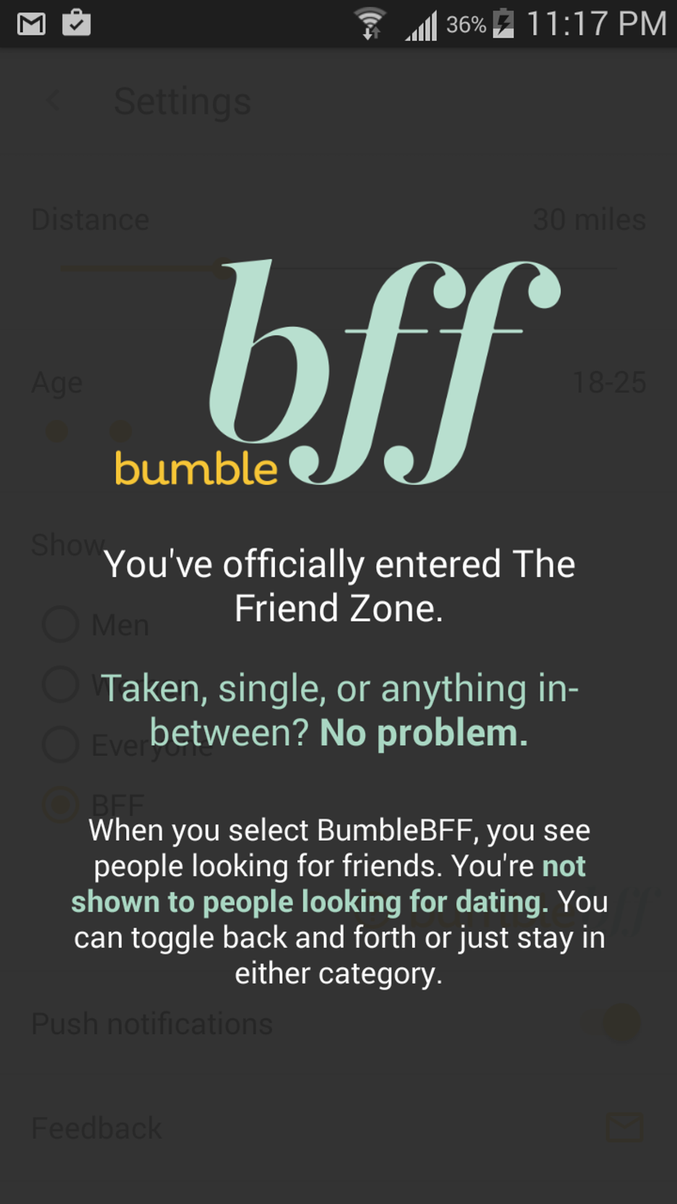 Now, if I had to make one critique of BumbleBFF, it would be the fact that there are not that many users. This could be because people do not know about the function, or the app itself (Tinder has 50 million downloads, while Bumble has 5 million), or the fact that people don't think they can make friends on the platform, but if I have said twice already, let me say it a third time: if we can make romantic connections on Tinder that sometimes lead to marriage, why can't we make friendships that lead to us being a bridesmaids at the other's wedding?