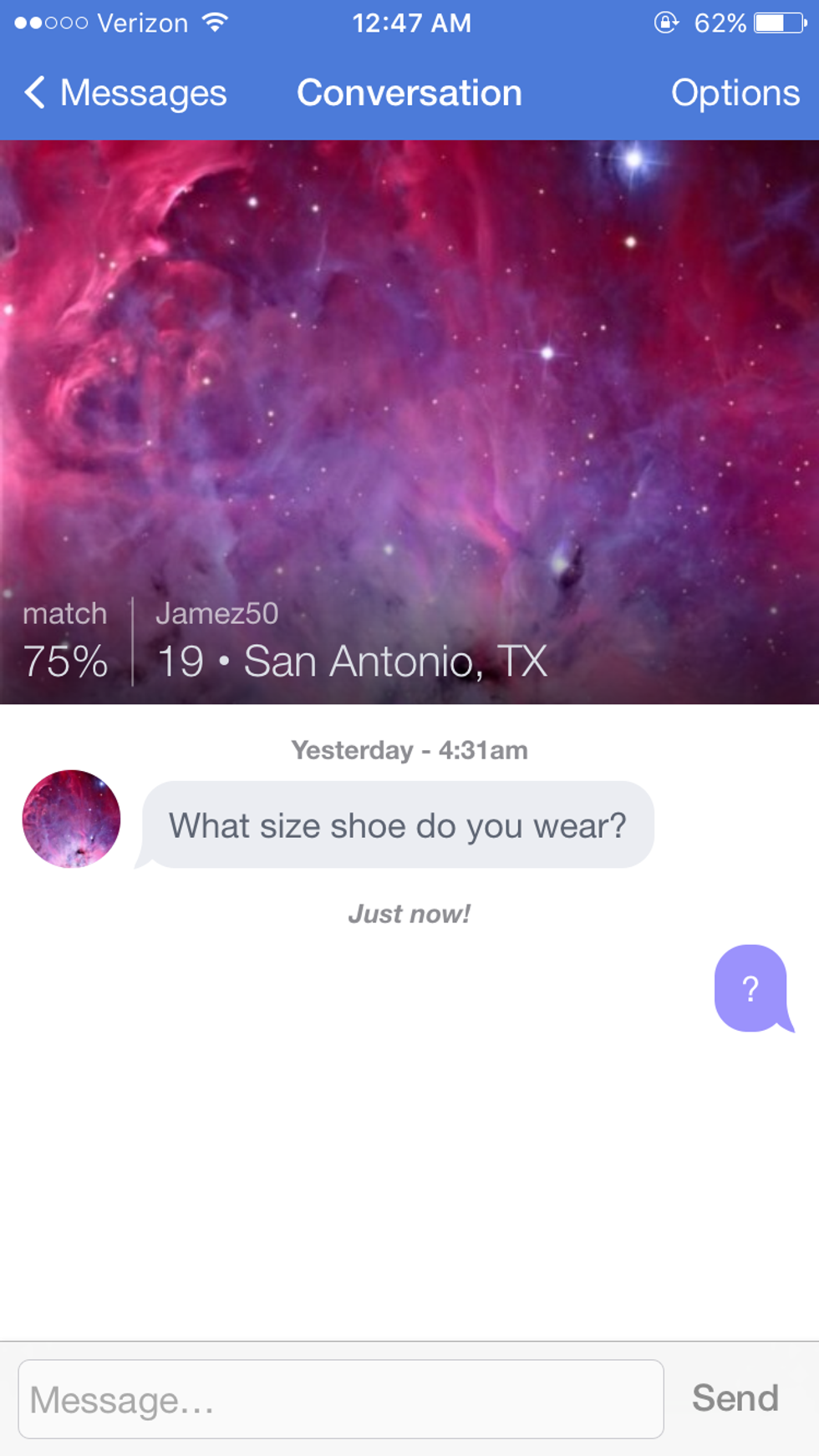 On this site, you answer all sorts of questions relating to ethics, dating, lifestyle, sex and religion and the site generates a match percentage to other users. The profile, rather than being just a simple, little “about me”, prompts users with areas like “What I’m Doing With My Life” and “6 Things I Couldn’t Live Without”. It then displays the categorized questions and based off those it draws some conclusions and lists you traits. For example, mine say more nerdy and literary, political, and less confident, trusting and dominate. Interested by the sites promises of actually looking into potential matches whether they be for dating or just meeting new people around me, I got right into it and found I immediately had some messages.