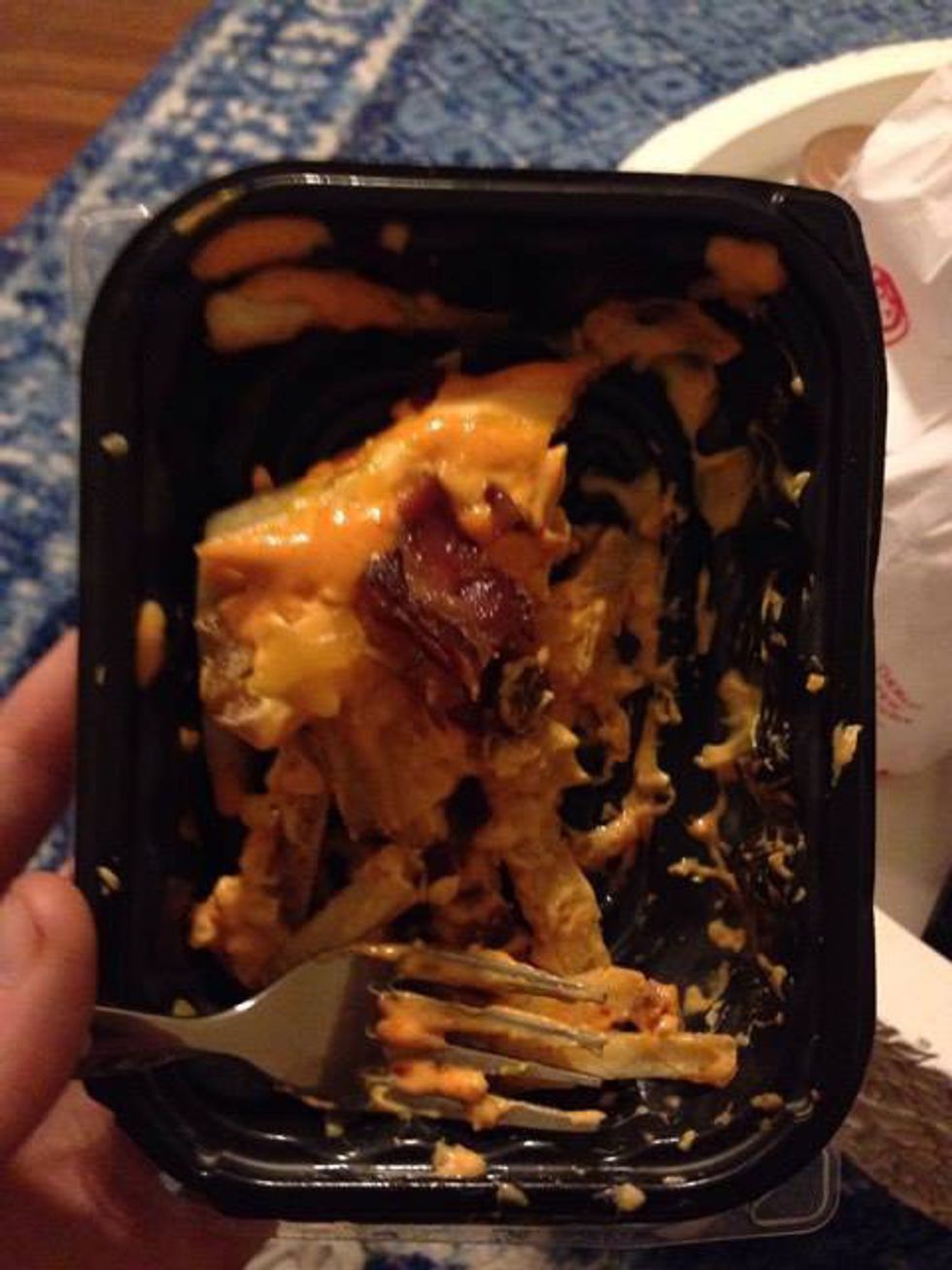Yet I pushed on. The thought came to my head that, well, even if it tastes bad I can write an article in the Odyssey about it. I took my fork and pierced the heart of the foul beast, at which it shrieked with the lost souls of the damned. No, this food wouldn’t be consumed in individual fries – the fries had somehow fused together and came out in mutated clumps. Not always covered in cheese either; it seemed that the layering had developed a rubber-like consistency that would slip away when pulled on, and needed to be cut apart to eat.