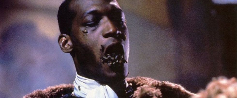 Tony Todd was an amazing actor. How do I know? Well...would you be able to sit with LIVE bees crawling around your face and mouth without screaming? Probably not. In the scene where the Candyman tries to kiss Helen, he opens his mouth to bees flying frantically out. He wore a mouth-guard to prevent any of them from going too far in his mouth or even down his throat. However, they could have stung him at any point. He just remained so calm that they didn't do anything to him.