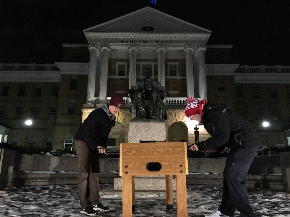 They hauled the foosball table out onto East Campus Mall and played a couple of friendly rounds; it aligned with the glow of the capitol beyond one end of the table and the luminescent reflection of Bascom Hill past the other. Then the came wild idea of continuing the game at the feet of the 16th president, because why the hell not? They then succeeded to scale Bascom hauling a 40-pound foosball table, to compete in the most epic game of table soccer in their lives, on an adventure that they had no idea was coming an hour earlier.