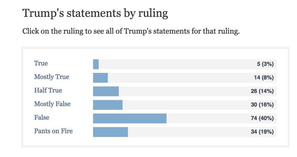 Politifact.com ran a test of Trump's statements since the campaign started, on a basis of Pants on Fire Liar to True: