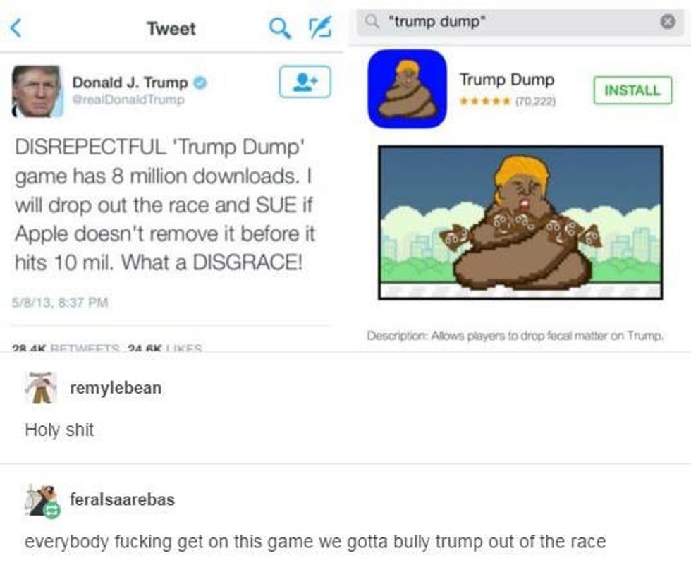 For those readers who have yet to download Trump Dump, I highly recommend it. It’s a delightfully simple way to vent the frustration that you might feel as this monster tries to make America great again. Plus, it has poop emoji’s, so that’s pretty cool.