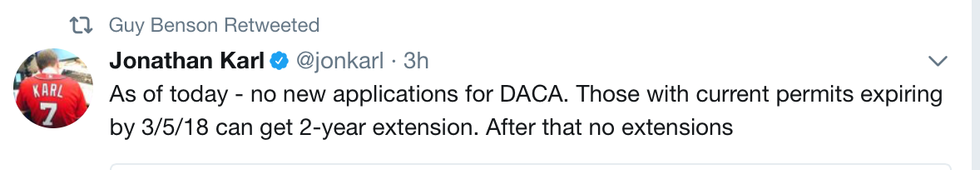 According to Jonathan Karl’s tweet, there will be no new applications for DACA. Those with current permits expiring by 3/5/18 can get 2-year extensions. After that, no extensions.