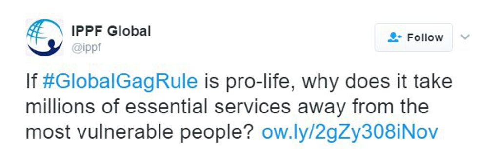 Before anyone tries to blame this type of issue on Planned Parenthood or any other organization which has chosen not to comply with the rule, remember that it is essentially a constant that women will have abortions. It is simply a question of whether they will be able to have them safely. IPPF wants to prevent the horrifying possibility of an abortion that is not professionally performed, and so they had no choice but to give up the federal funds. They didn't choose not to comply with the rule; they were coerced into making that difficult choice. This is not a question of whether women can get an abortion whenever they want from taxpayer dollars, allowed to be irresponsible and have unsafe sex. No, this isn't the issue, this has never been the issue. The deciding factor is women’s safety. It always has been. And if an international woman can get birth control from Planned Parenthood, she won’t even need to have the abortion that the supporters of this executive order want her to have. She will have a better life.