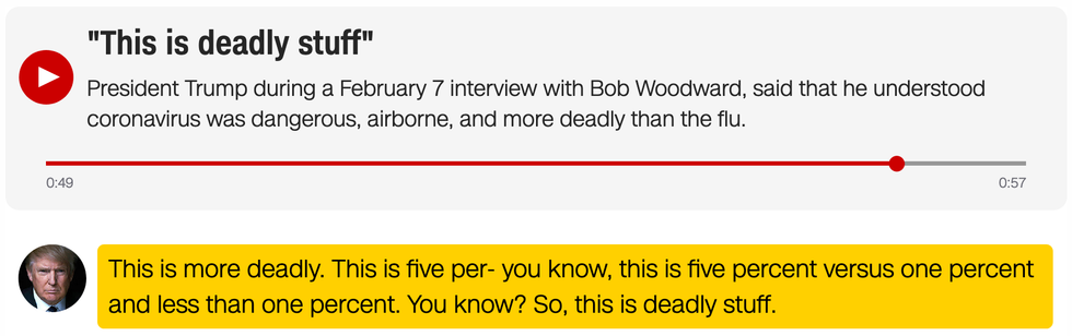 In a February 7 interview conducted by Woodward, Trump is heard on tape saying COVID-19 is "more deadly" than seasonal flu.
