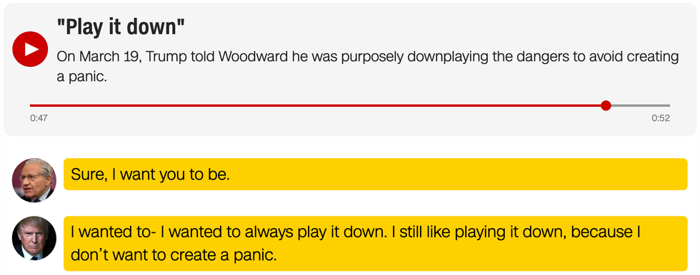 Trump also talked about playing down COVID-19 for the general public during a later interview with Woodward on March 19.