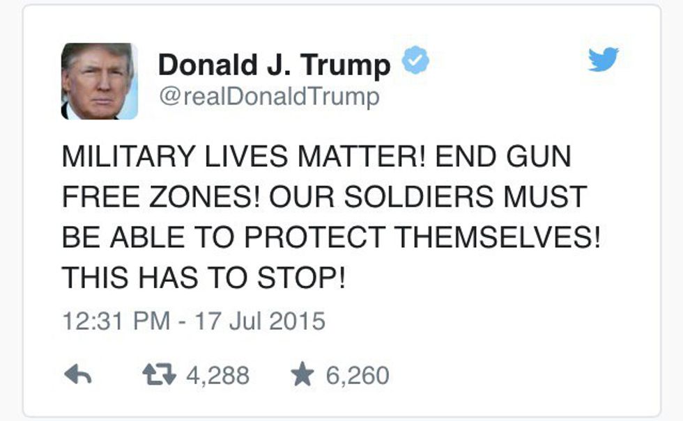 "Get rid of gun-free zones. The four great marines who were just shot never had a chance,” Trump tweeted shortly after the shootings. “They were highly trained but helpless without guns.”