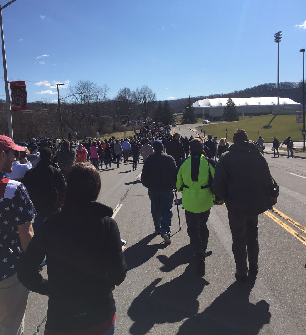 Now, remember this was still a regular Monday at Radford University. Some teachers cancelled class and other's didn't. I had an early class and a test to take that morning, so I couldn't get down to Dedmon until about 10:50 a.m. However, public transportation methods were blocked from going down University Drive to get to the arena, so I had to walk down there with a huge group of people, who ended up disregarding the sidewalk and filled up the streets.