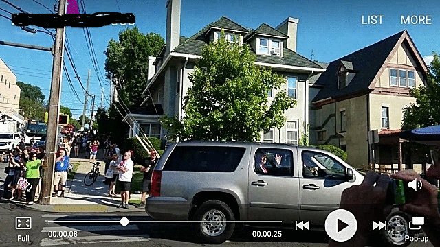Several black cars pass. Everybody maneuvers their camera phones in the appropriate position. Trump presses his hand against the glass window of his vehicle and waves to the crowd. "There he is!" screams a man standing next to me with his elderly father. The motorcade speeds forward and the king leaves Scranton.