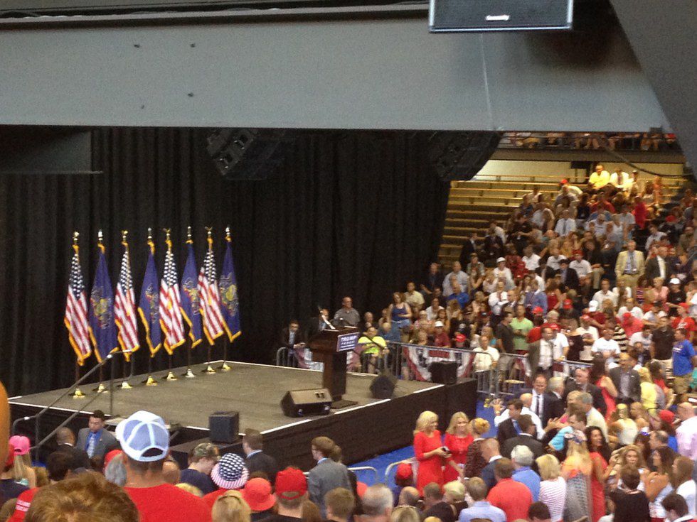 Donald Trump and Mike Pence finally enter the venue an hour late. The Vice-Presidential candidate speaks first. The audience listens politely, but must of the crowd desperately craves the main course, especially after such a long wait. Pence gives his token five-minute stump speech. He brags about his own accomplishments as governor of Indiana and forcefully endorses Trump.