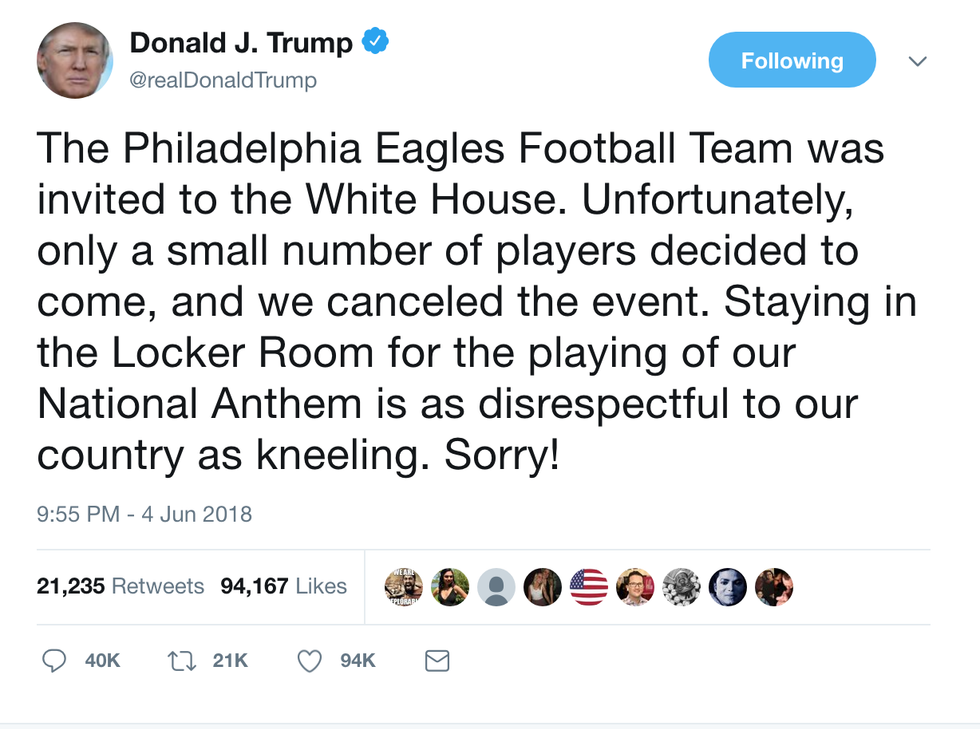 This tweet honestly is a gem. It simplifies the entire issue and when broken down highlights flaws in decision making continuously evident with Trump. First off, this is all about Trump's ego. Trump has no interest in letting an entire football team embarrass him by sending a small group. The group the Eagles were sending was reportedly going to be in the single-digits.