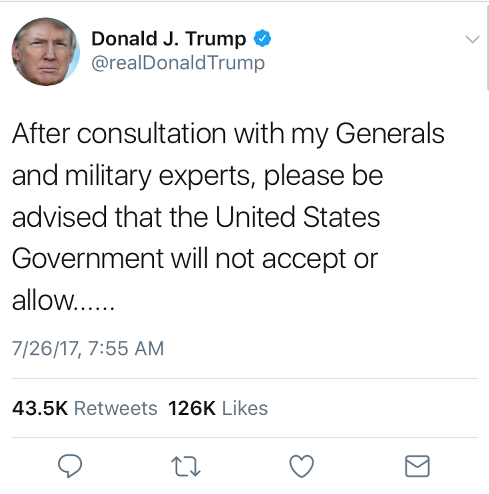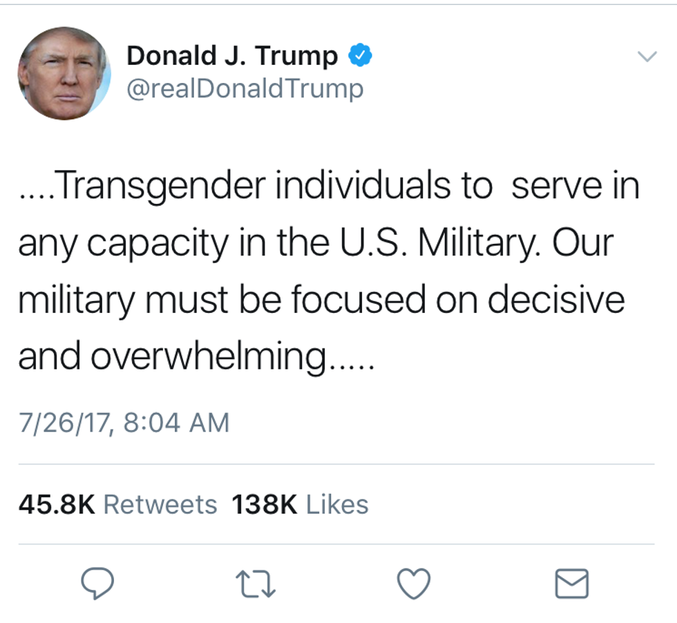 Trump has just announced his latest horrifying direction via Twitter and what one can assume to be his next big "policy"--when it comes to Trump and policy, one can only expect an Executive Order on its way.