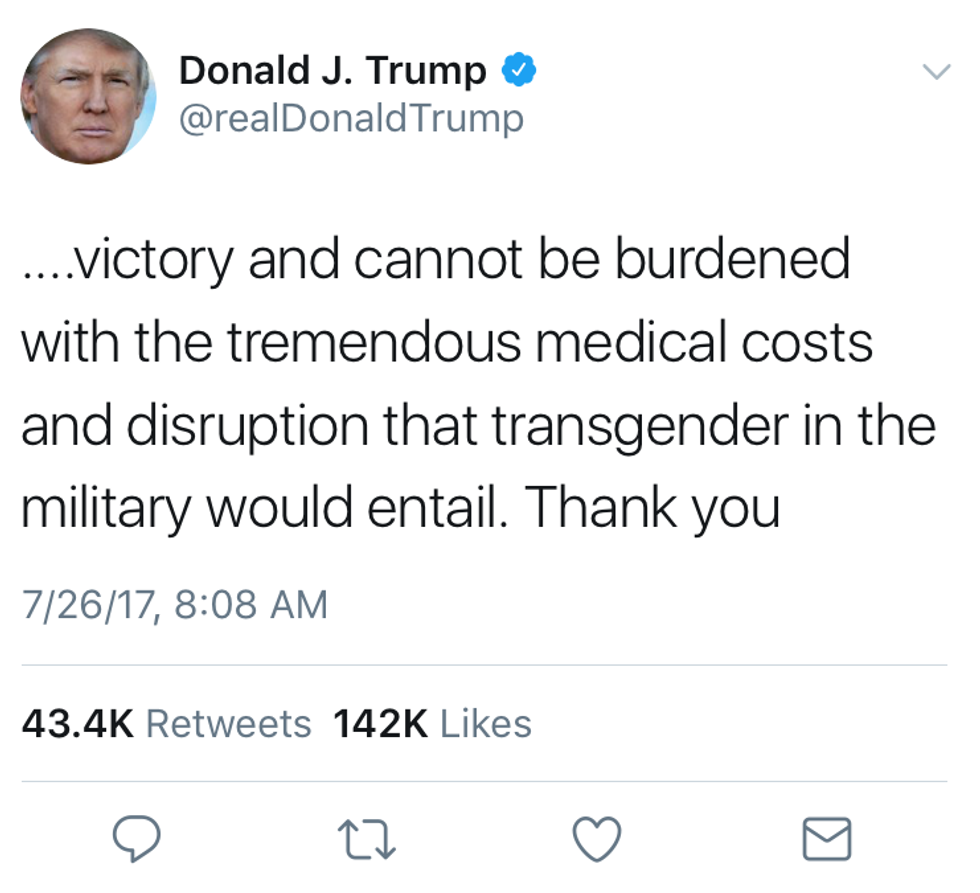 On the morning of Wednesday, July 26, the news broke that the Orange Cheeto has moved on from his anti-Muslim travel ban, and onto a ban on Transgender people in the military. There are a million reasons why this is a problem; the military has their own corrupted justice system. So Tr*mp, stay in your lane; that is, if you have one, the jury is still out. If the U.S. government decides to intervene with military legal matters, then the priority should be