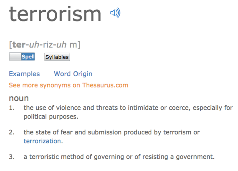 1. "The use of violence and threats to intimidate or coerce, especially for political purposes."