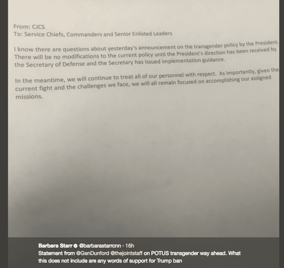 For now, the nation's military officials said in a letter on Thursday to Trump that there will be no changes to the military's transgender policy until after directions are sent to the Pentagon.
