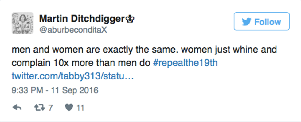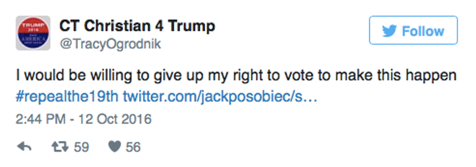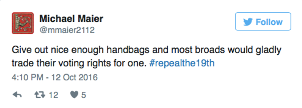 Some of Republican presidential nominee Donald Trump’s more aggressive supporters took to Twitter to discuss their stance on a woman’s right to vote through the trending hashtag “#RepealThe19th.” The hashtag was created following the release of a poll that showed that Trump would win the presidential election if just men were voting. Therefore, the most logical solution is to petition to abolish the amendment that granted women the right to vote.
