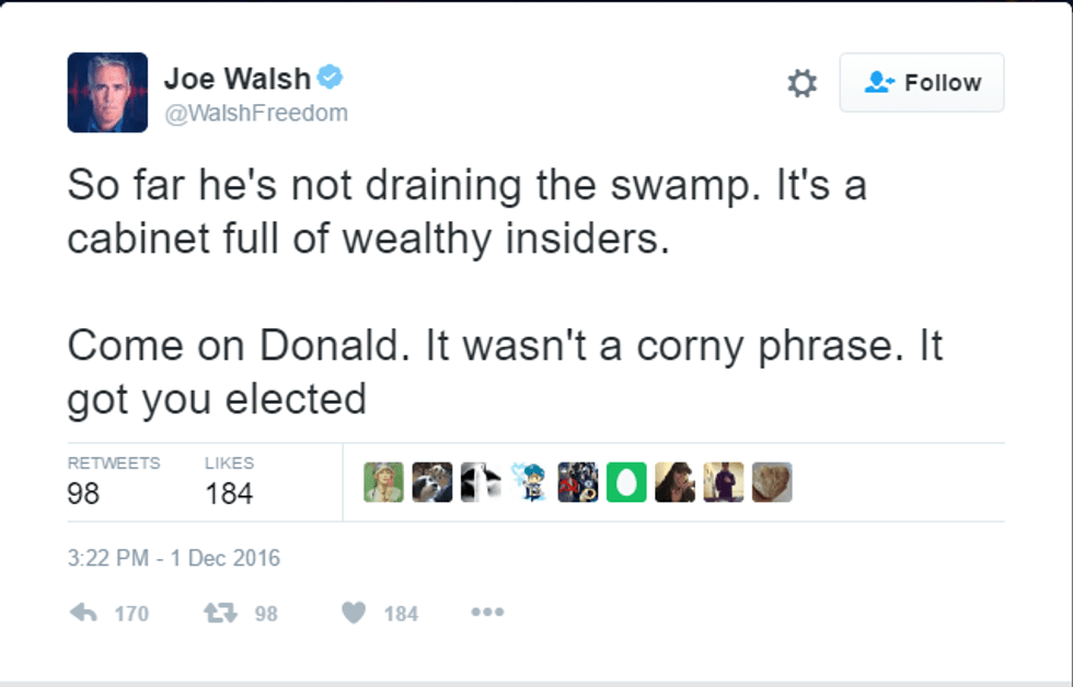 Many of his most avid supporters have already denounced these appointments, including former congressman Joe Walsh (@WalshFreedom) who showed disappointment over Trump’s consideration of former Goldman Sachs executive Steven Mnuchin for Secretary of the Treasury.