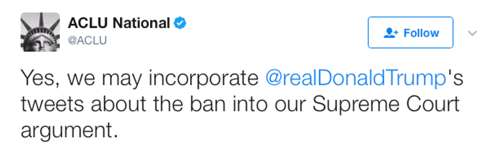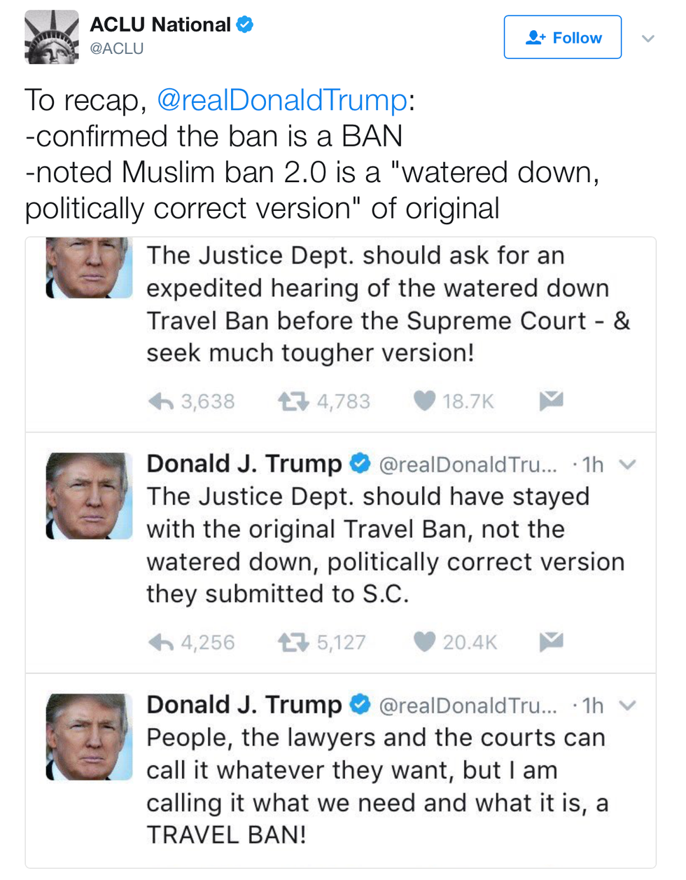 The ACLU stated in classic Trump fashion on Twitter, they would incorporate Trump’s tweets from his personal @realDonaldTrump handle in an ongoing attempt to defend lower court rulings blocking the travel ban.