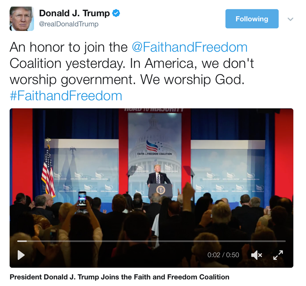 A recent tweet on Friday would suggest Trump is blurring the lines between the separation of church and state. This tweet, expressing that “In America… We worship God.” Poor grammar aside, I assume the majority of Americans (religious or not) can determine this to be a fallacy of composition.