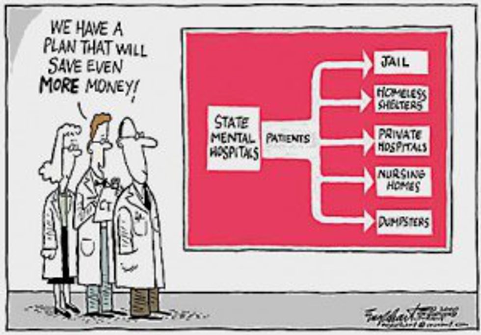 To compensate for the lack of facilities, states started to come up with different places to house their mentally ill. In 2015, The Huffington Post reported a case of what is called greyhound therapy, where someone is offered minimal treatment and then placed on a greyhound bus with a one way ticket. This was the story of a man who was placed on a greyhound bus in Las Vegas with a one way ticket to Sacramento instructed to call 911 when he gets there. They report that it's possible he was one of 1500 patients shipped off to places where they had no connections and little support.