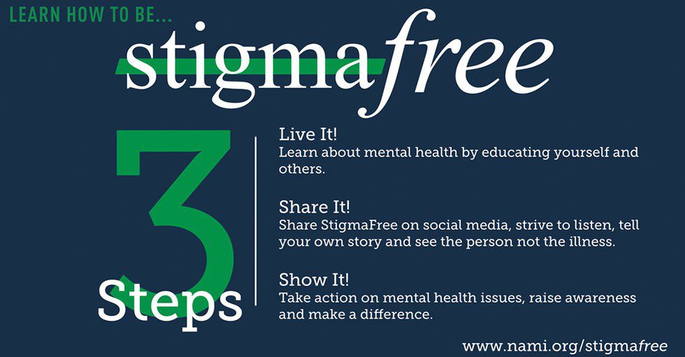 If you're not feeling motivated to take it this far, there is something even easier you can do to help make a change. The National Alliance on Mental Illness gives you an opportunity to take the pledge to be stigma free. By taking the pledge you're agreeing to learn the truth about mental illness, to see the person and not the illness, and to take action. Whether that action is contacting a congressman or just helping out a friend, by becoming stigma free you're helping others see that being mentally ill doesn't mean being crazy.