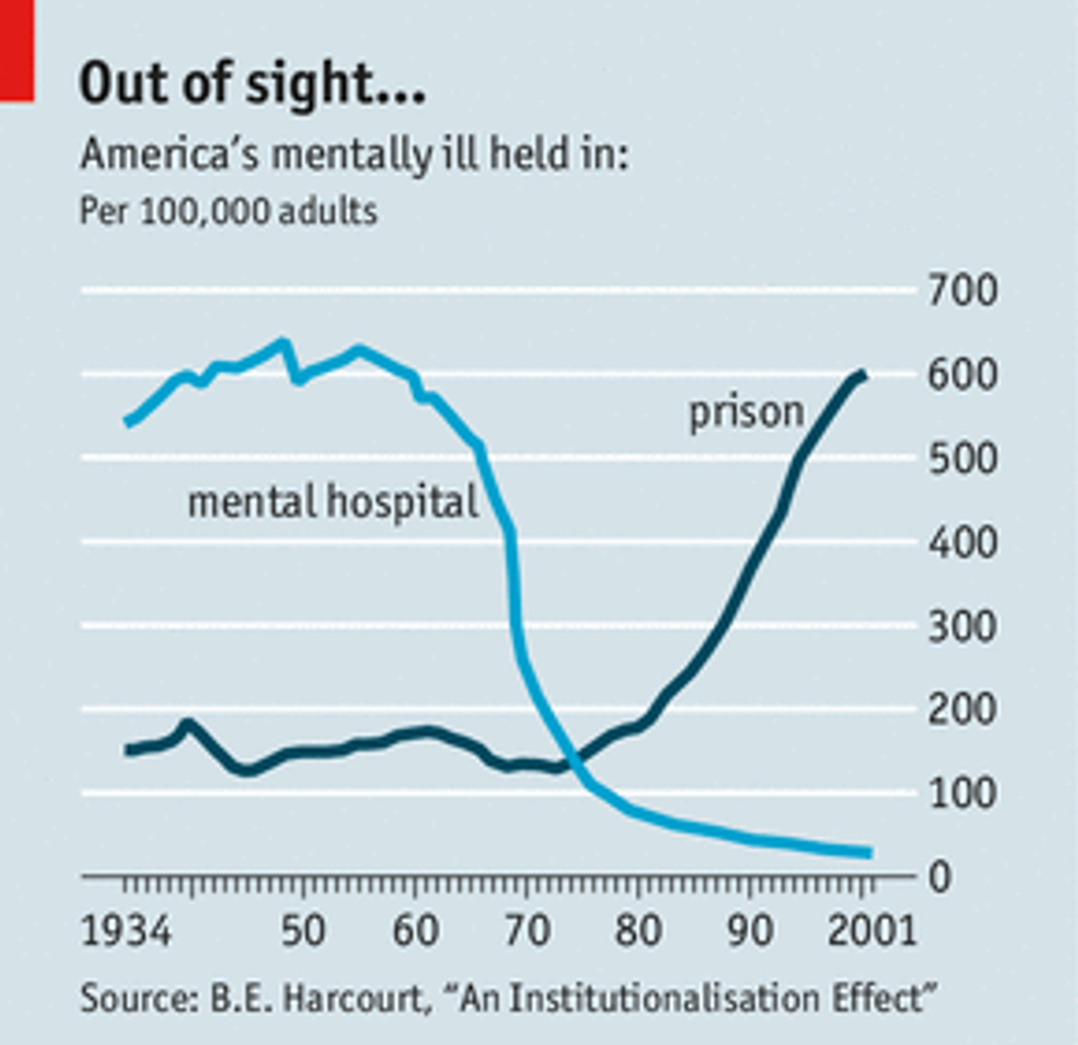 The mental health care system has never been at the levels it needs to be, but the issue with prisons has only been getting worse over the past 50 years. According to the Substance Abuse and Mental Health Administration, in 2013 the number of adults with a serious mental illness was approximately 10 million, which is more than the entire population of Switzerland.
