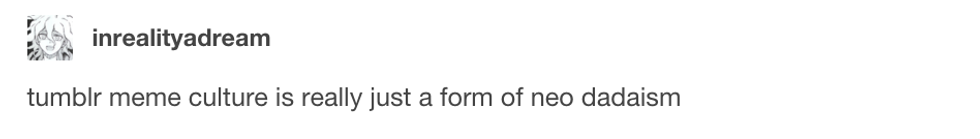 "I can’t help but think that these factors (and more) could produce a similar mindset to the one that precipitated the first dada movement, so of COURSE we make nonsense jokes. it’s a coping mechanism for a world which doesn’t make any sense."