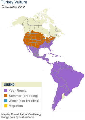 These birds are widespread and common throughout Mexico, South America, the United States and Southern Canada. They typically spend their summers in various parts of the United States (shown in orange). Here they will breed before soaring South for the winter (shown in purple). Turkey vultures will spend their time in open areas such as farmland, and prairies where they can easily spot their meals from above.