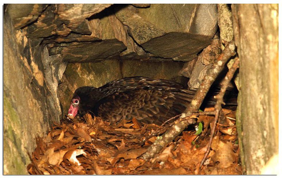 Turkey vultures are extremely secretive nesters. Very little is known about what goes on inside the nest of these birds. However, it is known that a pair of mated vultures will typically stay together for life and will work together to take care of their young by feeding their young regurgitated meat. Unlike other birds, turkey vultures lay their nests on cliffs or inside caves. The female will normally lay one or two blotchy white eggs, which will hatch after about a month.