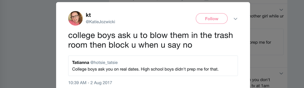So, yes, there are some college boys like my boyfriend who actually, you know, know how to date someone. I think the person who tweeted this originally didn't mean for it to turn the way it did, and I'm glad she's with someone who takes her out on nice dates. But the reality for many is very different. I think we all need to demand a little more of each other, and up our respect for each other. I promise it's not hard to be a decent human being.