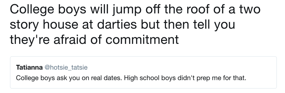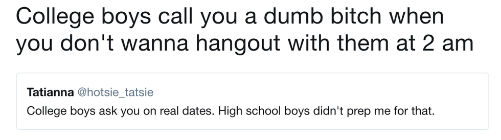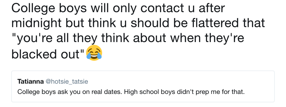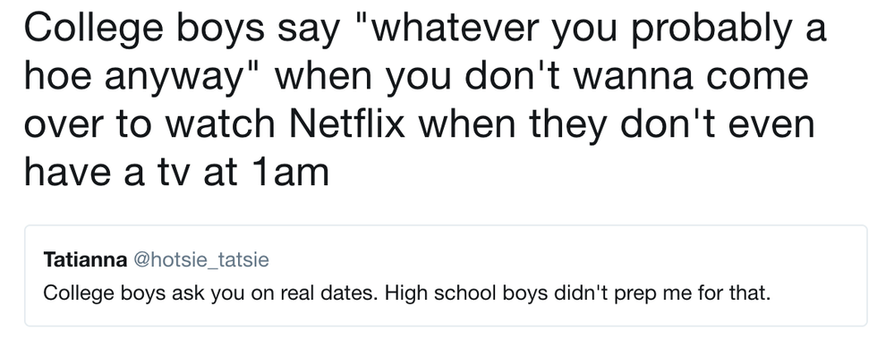 I'm sure by now some of y'all have seen that tweet that says "College boys ask you on real dates. High school didn't prep me for that." And, boy, were some of the responses hilarious. Here are some of my favorites: