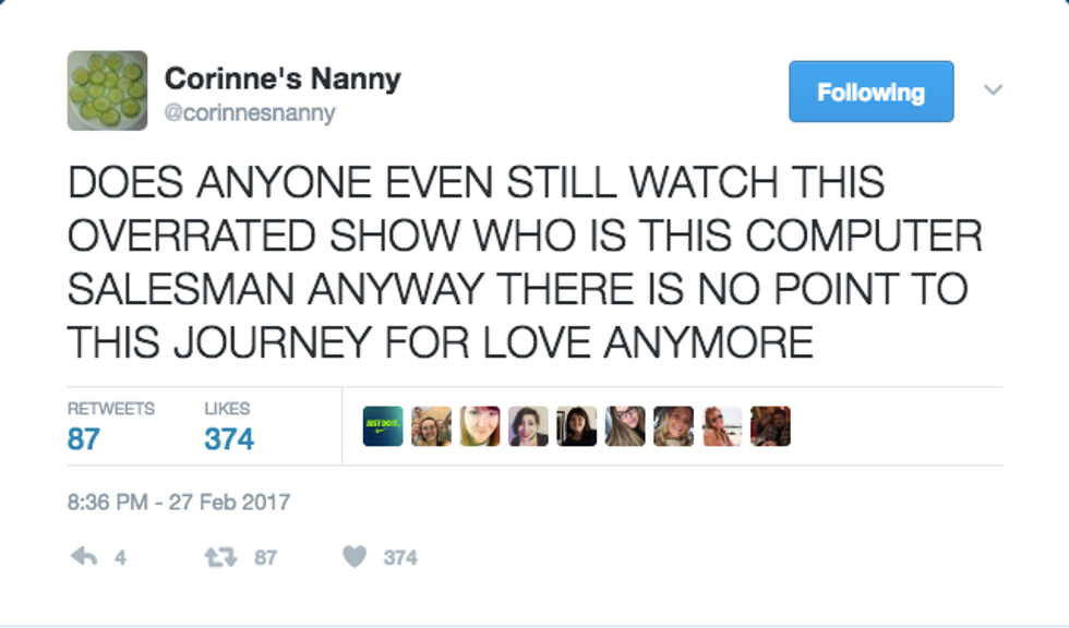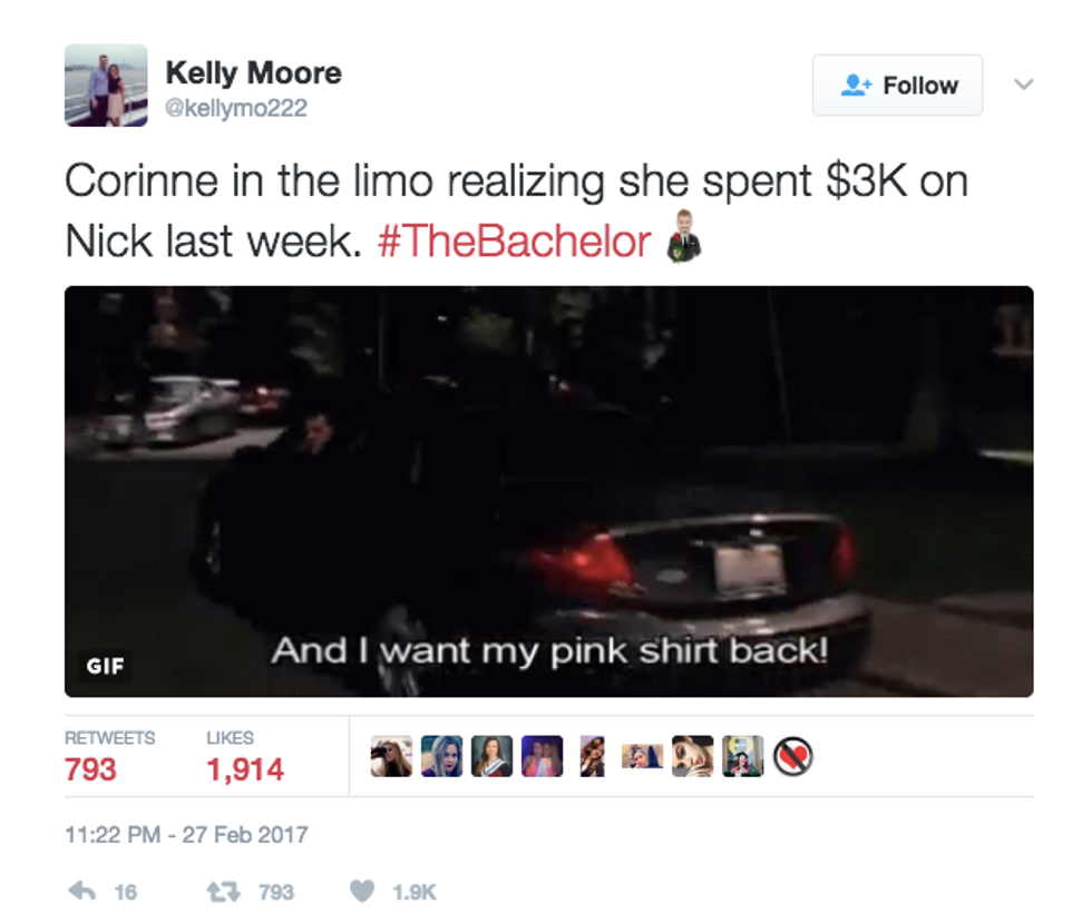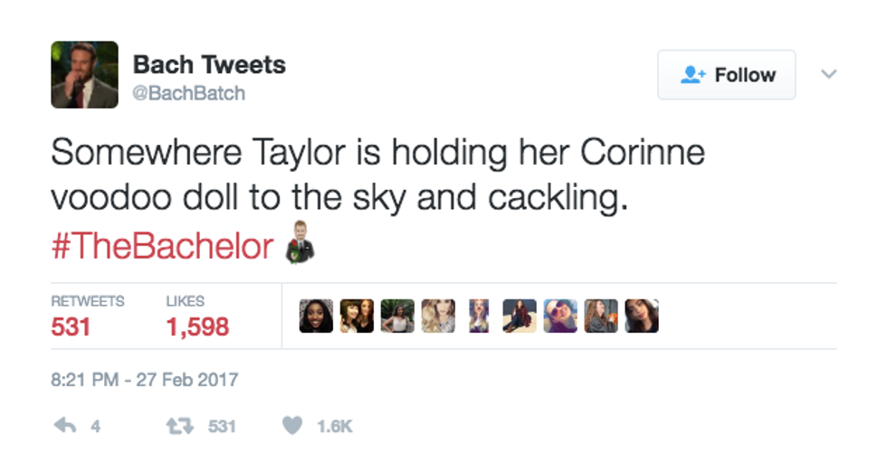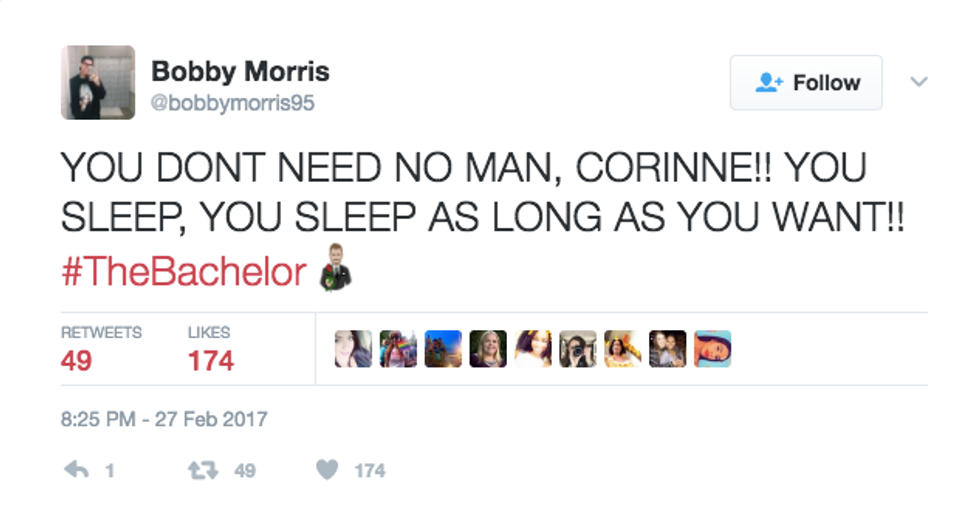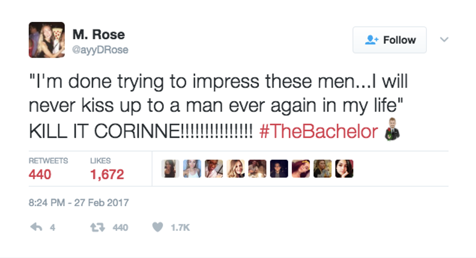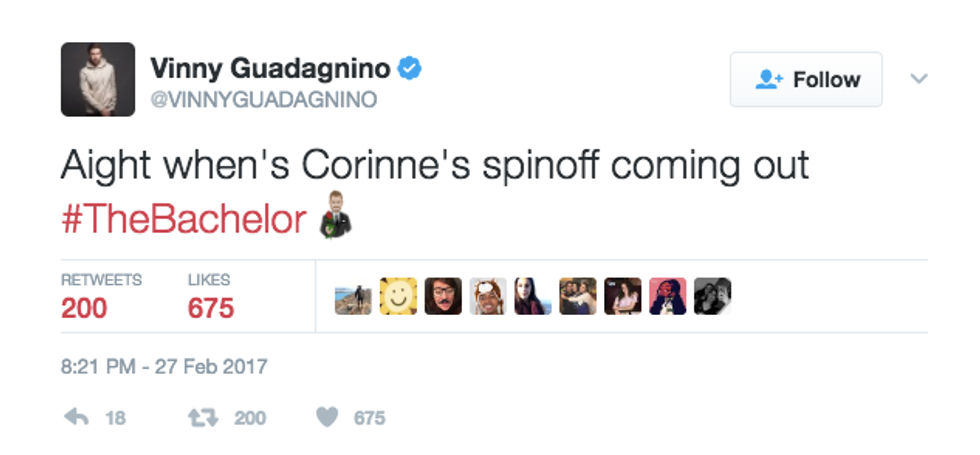 As sad as I am that Corinne Olympios left the Bachelor last week (goodbye, drama), I am excited that we know who the final two are now! Well, like any other fan of the Bachelor, I was on Twitter Monday night during the episode. As always, hundreds of tweets were about my good pal, Corinne. Here are a few of my favorites: