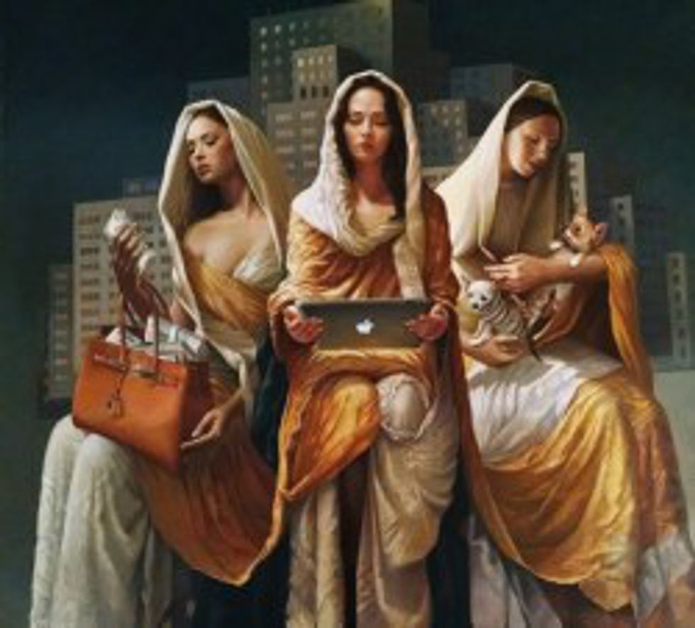 The drastic changes in communication and society in general were felt all around the world at the turn of the 21st century; however, instead of fighting these new changes to society, Vladimir Putin embraced them. The new forms of communication allowed for Putin to easily spread his ideas to every corner of Russia, and it also allowed him to control the news that his citizens would be receiving, very similar to the way Stalin controlled the news in Soviet Russia. Stanislav Plutenko, an acrylic painter from Russia, recognized the changes that Russia was beginning to face. The artist also recognized that with these new changes, it would be hard for many Russians to continue praising the old Soviet ideals while also keeping up with the ever changing technology that was beginning to invade their everyday lives. Stanislav Plutenko’s acrylic painting “Madonnas of Modernity” depicts the nostalgia for Russia’s great past, as well as the need to keep up with society and all the new devices and forms of communication that came with it.