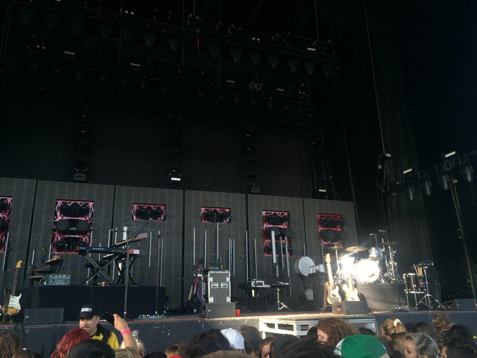 Being surrounded by other fans is always an amazing experience and feeding off everyone else's energy, we were able to survive the three-hour wait without any cell-service or Wi-Fi. We were let into the amphitheater, corralled through all the food stands, and were placed down by the stage. The stage was quite large and tall which gave us an amazing view even if we were about seven or eight rows back.