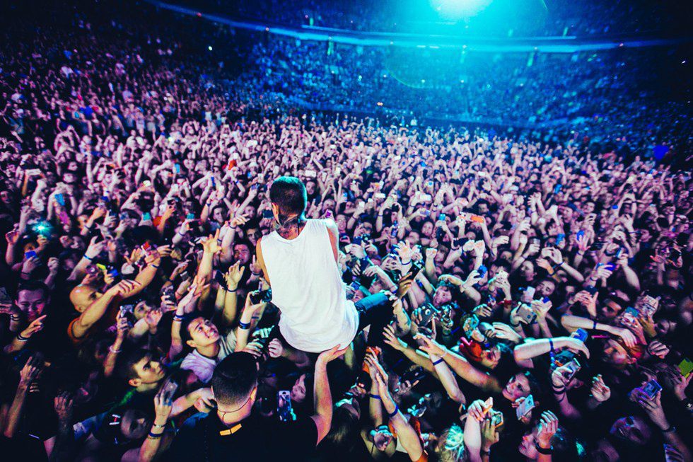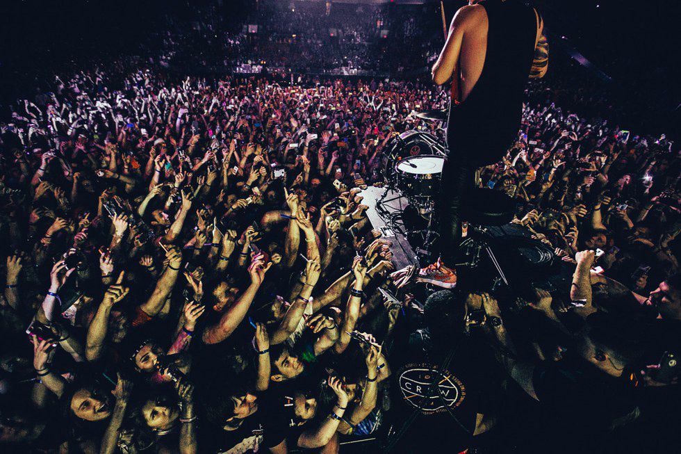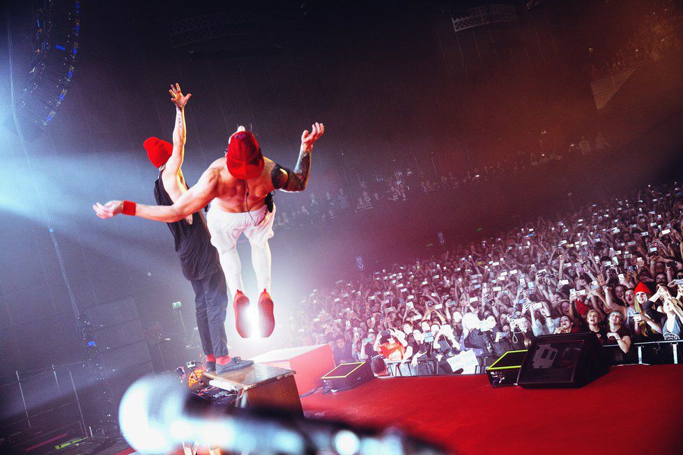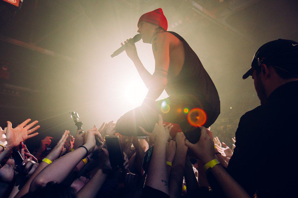twenty one pilots, also known as tøp, and iconically spelled completely in lowercase, create their own music for their live shows - not the studio - and it shows as soon as the lights go down in the venue. They do not believe in a show where the band just stands on the stage and plays while the crowd just watches. They break the barricade as many times as allowed.