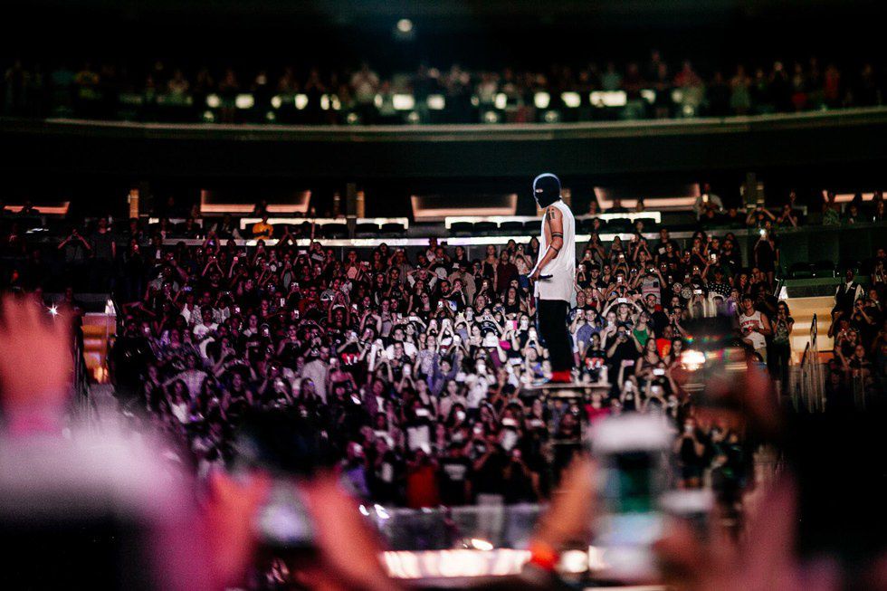 As the energy grows higher, so does the interaction. The first is during "Hometown", where Tyler shows up in the crowd on the opposite side of the venue in lower level seating and finishes the song in the stands before taking the black mask off.